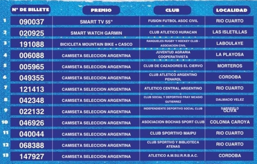 El mismo se llevó a cabo en el salón de sorteos de la Lotería de Córdoba y los premios fueron para los siguientes clubes: