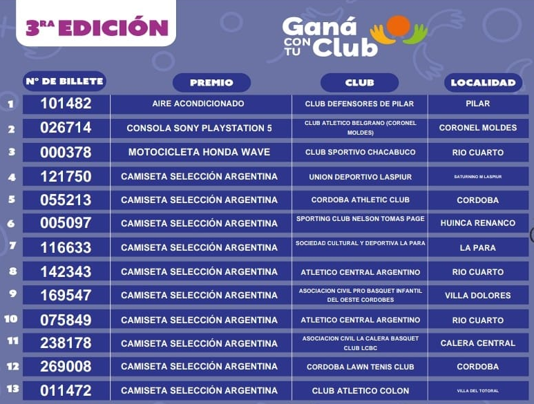 El mismo se llevó a cabo en el salón de sorteos de la Lotería de Córdoba y los premios fueron para los siguientes clubes: