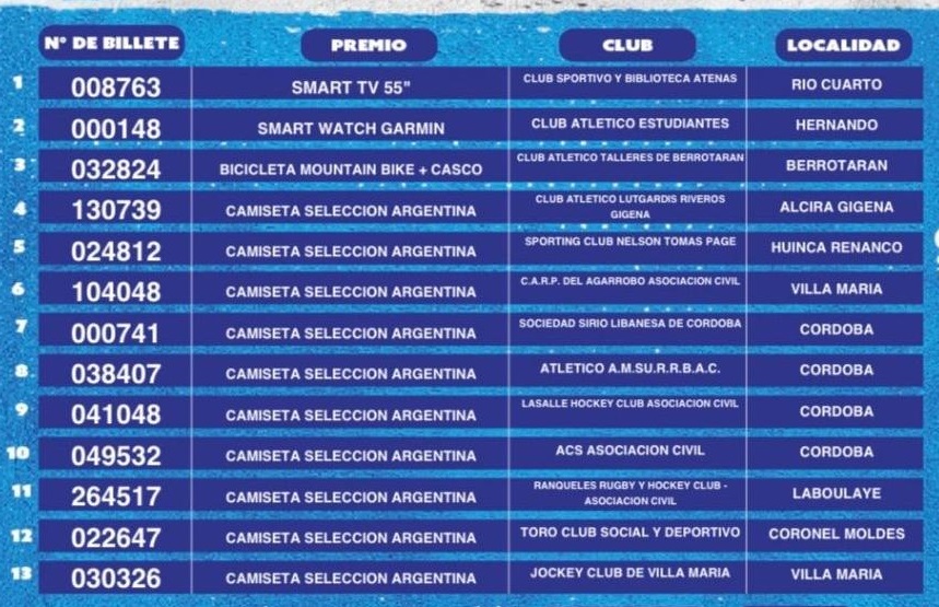 El mismo se llevó a cabo en el salón de sorteos de la Lotería de Córdoba y los premios fueron para los siguientes clubes: