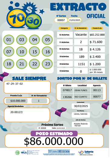 Este sábado 15 de Marzo de 2025 se realizó el Sorteo Nº 7 del 70/30.